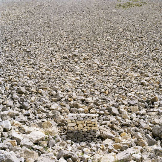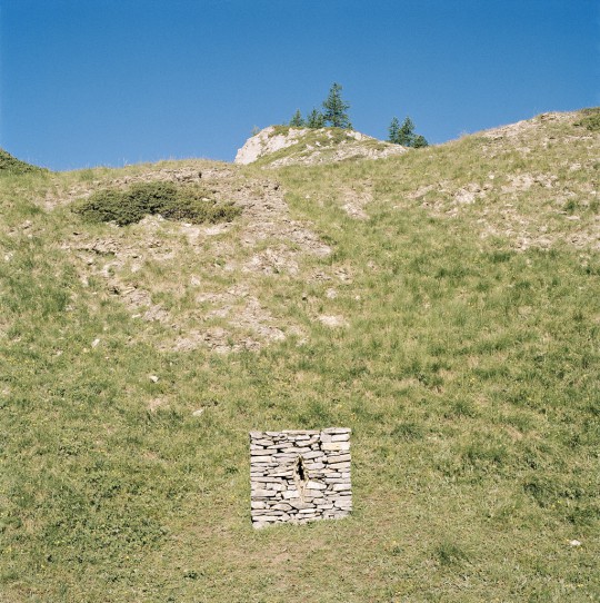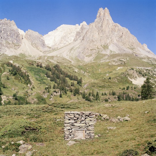 Champs d’altitude est un projet à la fois photographique et d’installation in situ.Dans le processus de création, j’ai mis en place un même protocole de construction pour toutes les installations. Un cube de dimension identique se répète neuf fois, architecturé différemment selon le paysage dans lequel il est installé. Les images jouent des stéréotypes et des références de l’imaginaire de la montagne.